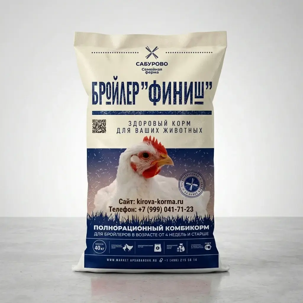 Финишный комбикорм для максимального итогового привеса. Оптимальный баланс питательных веществ, отличные вкусовые качества мяса. Привес к 42 дню — до 94 г/сутки. Подробное описание: Бройлер ФИНИШ — это заключительный этап в программе кормления цыплят-бройлеров (с 28 по 42 день). Комбикорм обеспечивает максимальный итоговый привес и отличные вкусовые качества мяса. 🔬 Почему выбирают Бройлер ФИНИШ? ✅ Максимальная конверсия корма — оптимальный набор питательных веществ ✅ Высокие привесы — до 94 г в сутки при соблюдении норм содержания ✅ Экологичность — без гормонов и стимуляторов роста ✅ Отличные вкусовые качества мяса — залог успешных продаж ✅ Ферментный комплекс — для максимального усвоения 📊 Показатели качества: Параметр Значение Обменная энергия ≥ 315 ккал/100г Сырой протеин ≥ 17,5 % Сырой жир ≥ 7,5 % Сырая клетчатка ≤ 4,8 % Лизин ≥ 0,95 % Метионин+цистин ≥ 0,81 % 📋 Состав: Зерновое сырье, белковое сырье, белок животного происхождения, масло растительное, минеральное сырье, витаминно-минеральный премикс, аминокислоты, ферменты, фитобиотик, адсорбент микотоксинов, подкислитель. 🍽️ Рекомендации по кормлению: 5 неделя: 155–190 г на голову в сутки 6 неделя: 190–220 г на голову в сутки Обеспечить постоянный доступ к корму и воде После достижения товарного веса перевести на менее питательные корма до убоя 📦 Упаковка: ламинированные мешки по 25 кг ⏳ Срок хранения: 6 месяцев с даты изготовления