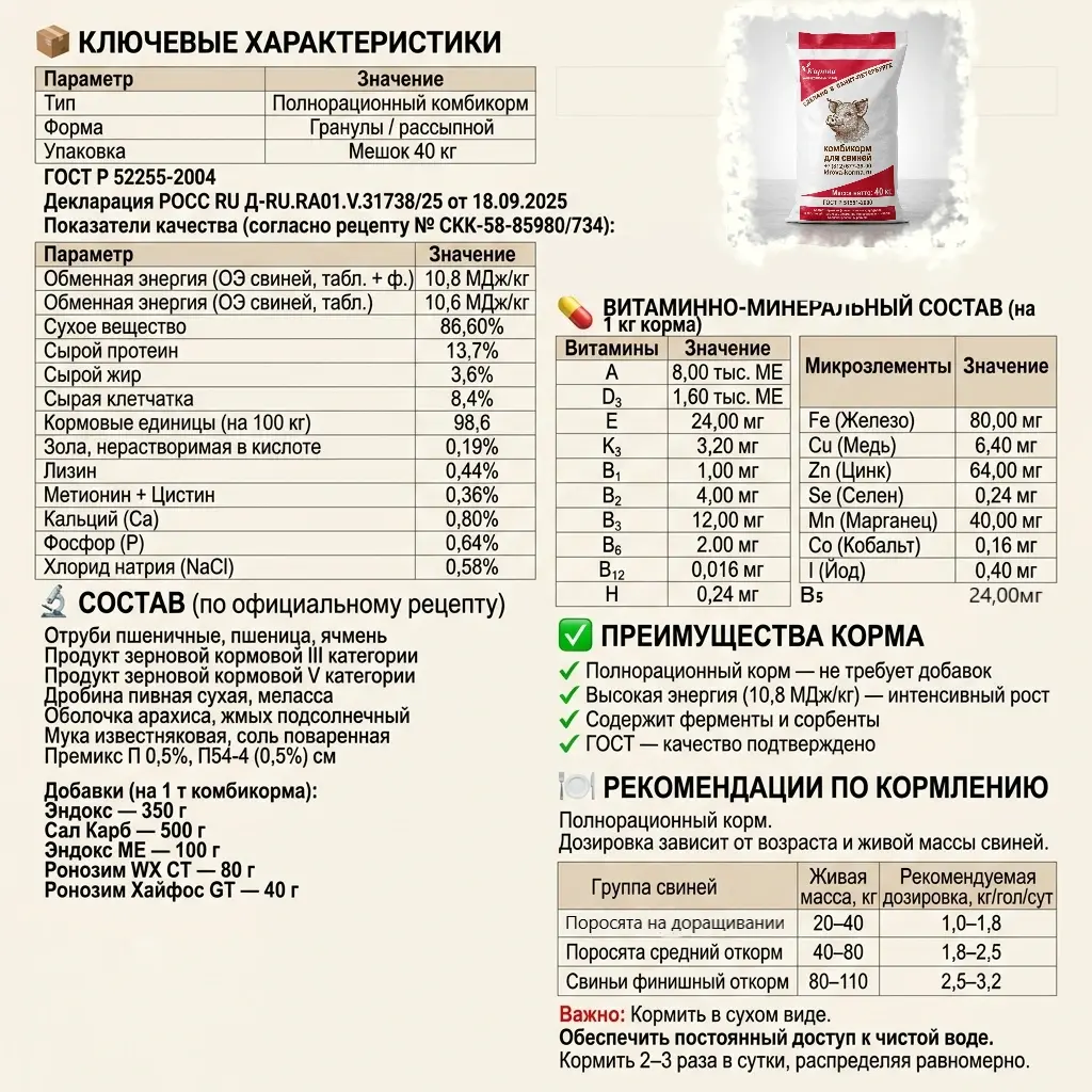 Марка 736 Корм для быстрого и экономичного набора массы. Высокая энергия (10,8 МДж/кг) и сбалансированный протеин (13,8%) обеспечивают интенсивный рост. Включает ферменты (Ронозим) для лучшего усвоения питательных веществ и премикс для здоровья. Ключевые преимущества: ✅ Высокая энергия 10,8 МДж/кг — основа для максимальных среднесуточных привесов. ✅ Сырой протеин 13,8% — сбалансированный белок для роста мышечной ткани. ✅ Технология усвоения — ферменты (Ронозим) повышают доступность фосфора, улучшая конверсию корма. ✅ Прочность костяка — гарантированный уровень кальция (0,7-0,9%) и фосфора. Подробное описание: СКК-58: Формула эффективного откорма. Этот комбикорм разработан для получения максимального результата при финальном откорме свиней. Он концентрирует внимание на двух ключевых показателях: энергии для роста и усвояемости для экономии. Энергия для привеса: 10,8 МДж/кг обменной энергии — это топливо для быстрого набора живой массы. Баланс для мяса: 13,8% сырого протеина поддерживают формирование качественной мышечной ткани, а не сала. Экономия через усвоение: Ферменты (фитаза) в составе увеличивают доступность фосфора из растительного сырья. Это значит, что больше питательных веществ идёт в рост, а не выводится. Гарантия безопасности: Производство по ГОСТ 52255-2004. Продукт декларирован и имеет маркировку «НЕ ТОКСИЧЕН».
